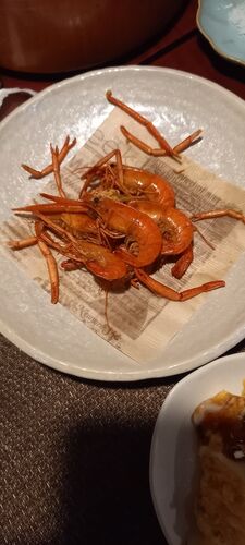 テナガエビの唐揚げ 高知の料理やでこんなものがメニューにあった。 テナガエビの唐揚げ。 四万十川産とのこと。 川エビの唐揚げは居酒屋によくあるが、 水族館でよく見るテナガエビの唐揚げとは。 早速注文。 おお。 いつも緑のテナガエビも揚げるとやっぱ…